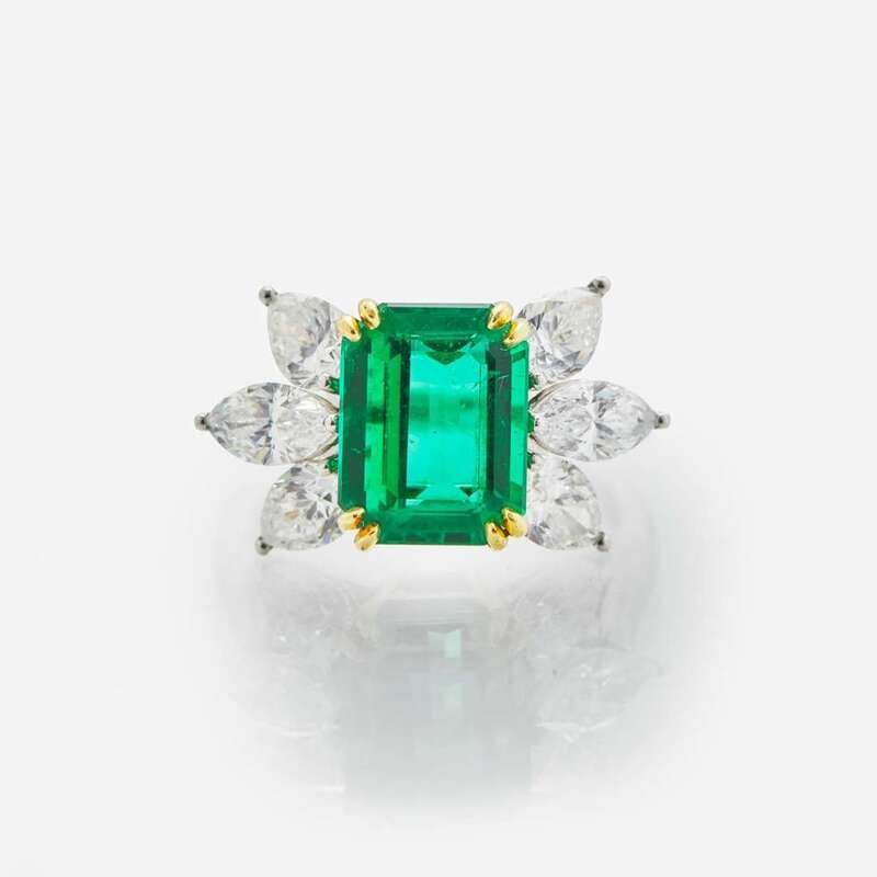 A platinum ring by Tiffany & Co. centering a transparent green natural beryl Zambian octagonal step-cut emerald measuring approximately 10.37mm x 8.06mm x 5.01mm, and accented by two marquise-cut and four pear-shape diamonds. Diamonds are near colorless (G - H), with VS clarity. Total estimated weight of diamonds: 1.70 carats. Emerald accompanied by GIA Report Number: 6224840961.