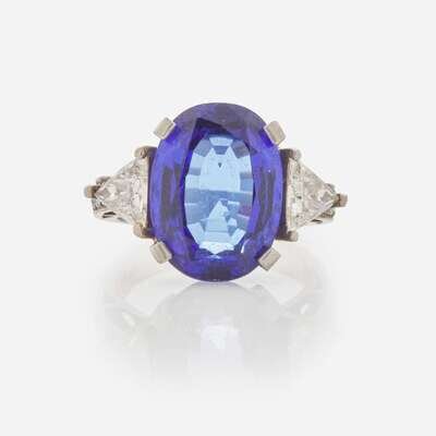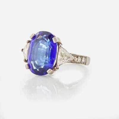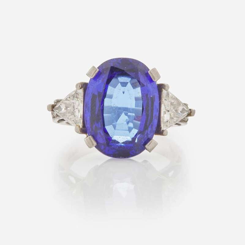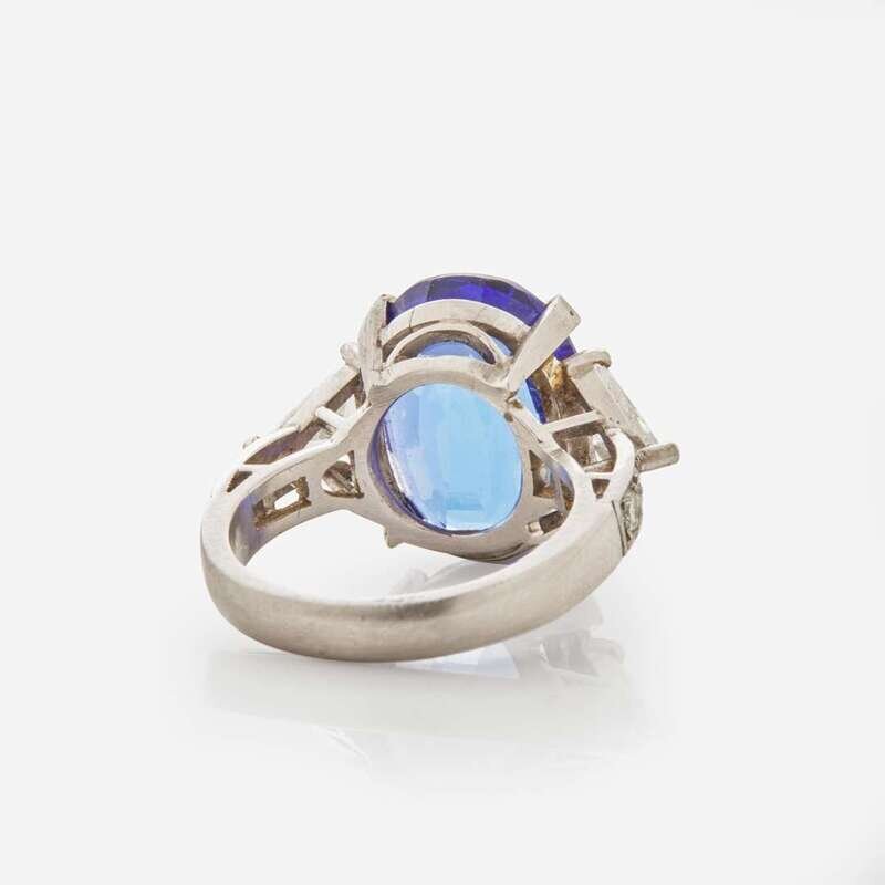A platinum ring set with an oval-cut tanzanite measuring approximately 15.30mm x 11.49mm x 7.00mm, accented by two trillion-cut diamonds and four round brilliant-cut diamonds. Diamonds are near colorless (G - H), with SI clarity. Total estimated weight of diamonds: 1.32 carats.
