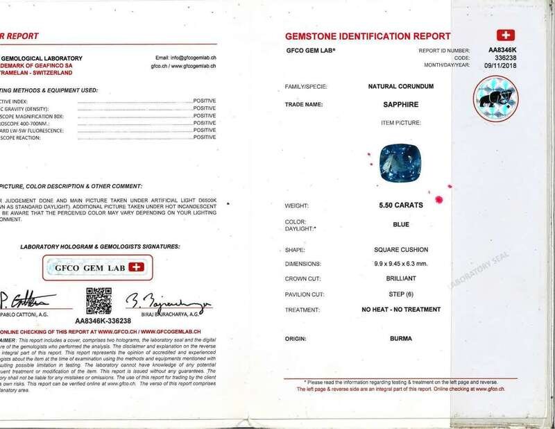 A platinum ring centering a 5.50 carat Burmese brilliant step-cut square cushion natural corundum sapphire measuring approximately 9.90mm x 9.45mm x 6.30mm with no signs of heat treatment, accented by thirty-seven round brilliant-cut diamonds. Diamonds are near colorless (F - G), with VS clarity. Total estimated weight of diamonds: 1.00 carat. Sapphire accompanied by GFCO Gem Lab Gemstone Identification Report Number: AA8346K.