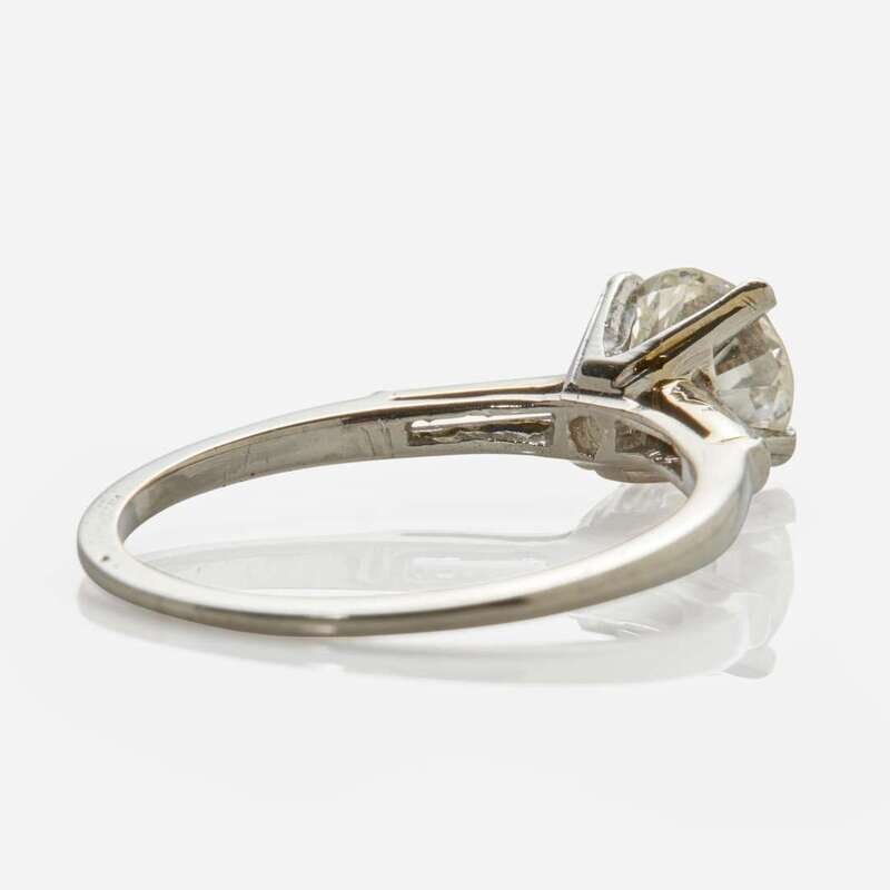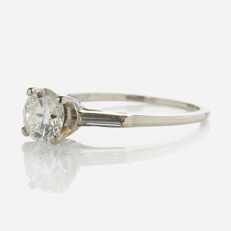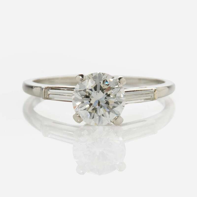 A platinum ring centering a round brilliant-cut diamond weighing approximately 1.20 carats, flanked by two elongated straight baguette-cut diamonds each measuring approximately 0.10 carats. Diamonds are near colorless (G - H), with VS1 - VS2 clarity. Total estimated weight of diamonds: 1.40 carats.