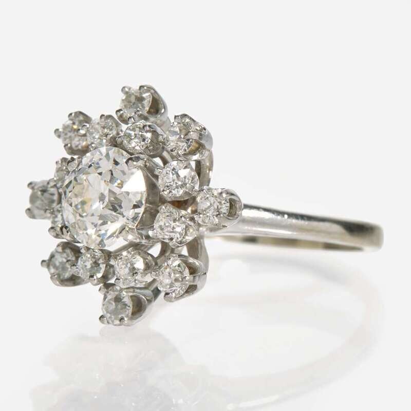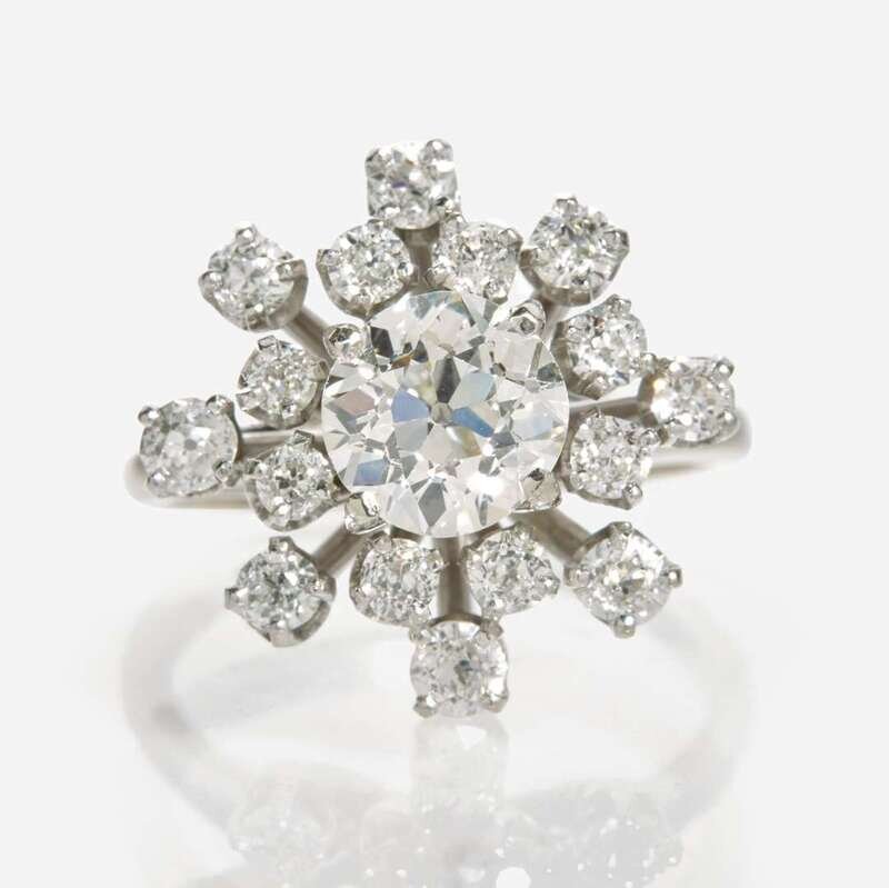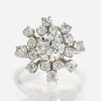 A 14K white gold ladies ring designed as a cluster of diamonds, centering a 1.44 carat old European brilliant-cut diamond surrounded by sixteen smaller near colorless old European-cut diamonds. Center diamond is near colorless (I), with VS2 clarity, and faint fluorescence. Total estimated weight of diamonds: 2.34 carats. Accompanied by GIA report number: 2221794261.