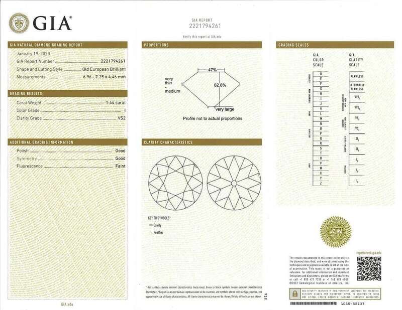 A Ladies 14K White Gold and Diamond Ring 1.44 Carat Old European Brilliant Diamond, GIA Certified