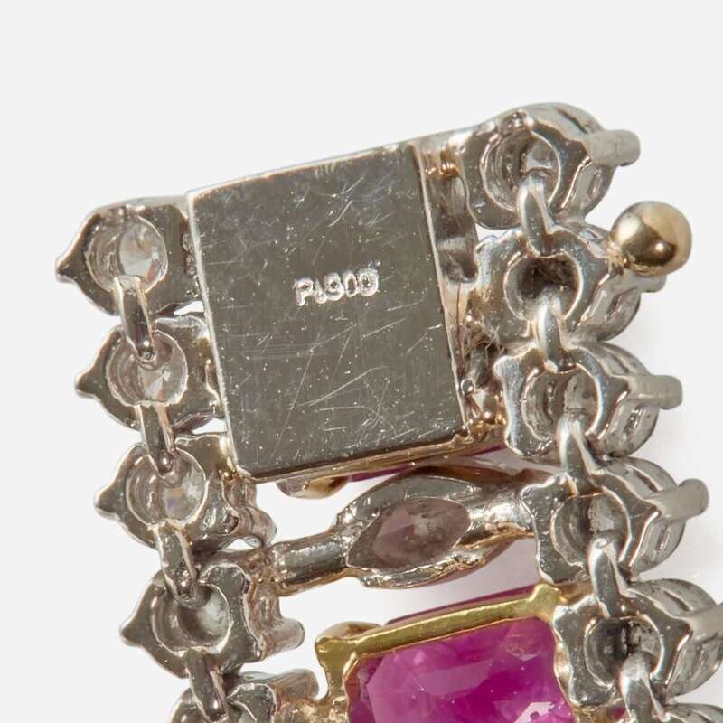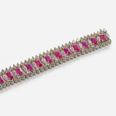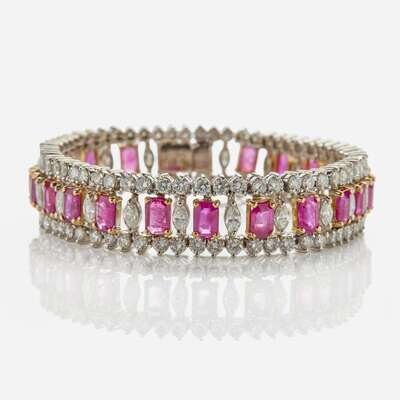 A platinum and yellow gold bracelet set with twenty-three emerald-cut rubies each measuring approximately 3.96mm x 5.96mm, approximately 15.00 carats altogether, twenty-three marquise-cut diamonds, and one hundred twenty round brilliant-cut diamonds. Diamonds are near colorless (F - G), with VS1 - VS2 clarity. Total estimated weight of diamonds: 10.00 carats.