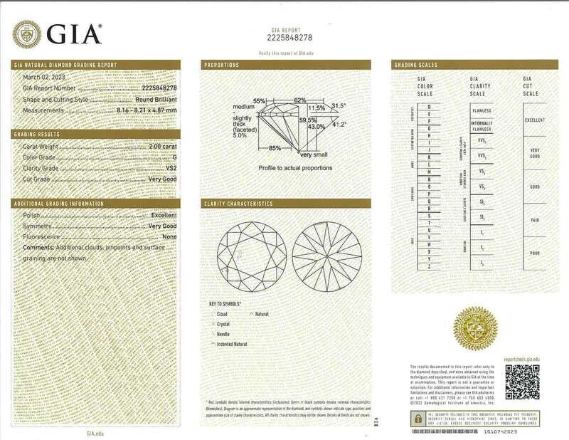 An 18K white gold ring set with a 2.00 carat round brilliant-cut diamond, accented by eight round brilliant-,cut diamonds each weighing approximately 0.01 carats leading down the shank. The center diamond is accompanied by GIA report number: 2225848278 stating a 2.00 carat round brilliant cut diamond G Color with VS2 clarity. Total estimated weight of diamonds: 2.08 carats.