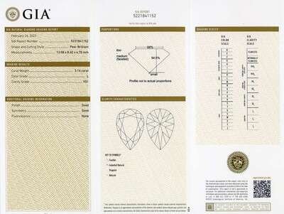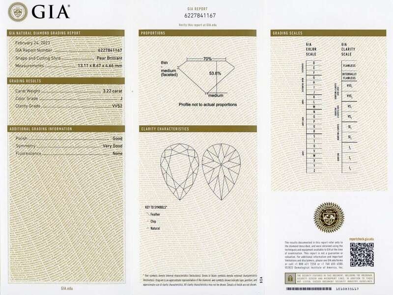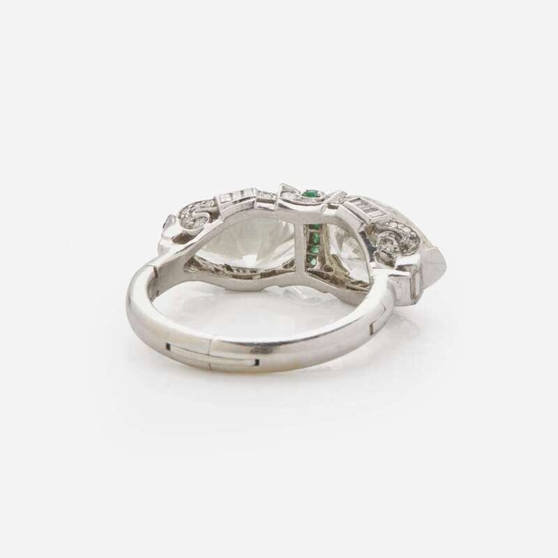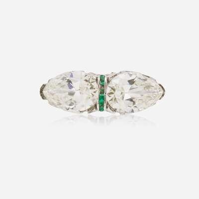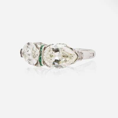 A 14K white gold antique pear-shape diamond ring, with two pear-shape diamonds separated by six calibre-cut emeralds each measuring approximately 2.30mm x 1.30mm, with baguette-cut and single-cut diamonds set in the gallery of the ring. The 3.16 carat pear-shape diamond has faint color (L), with VS1 clarity, and the 3.22 carat pear-shape diamond has faint color (J), with VVS2 clarity. Pear-shape diamonds are accompanied by GIA Report Numbers: 5221841152 and 6227841167.