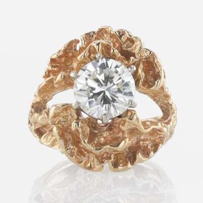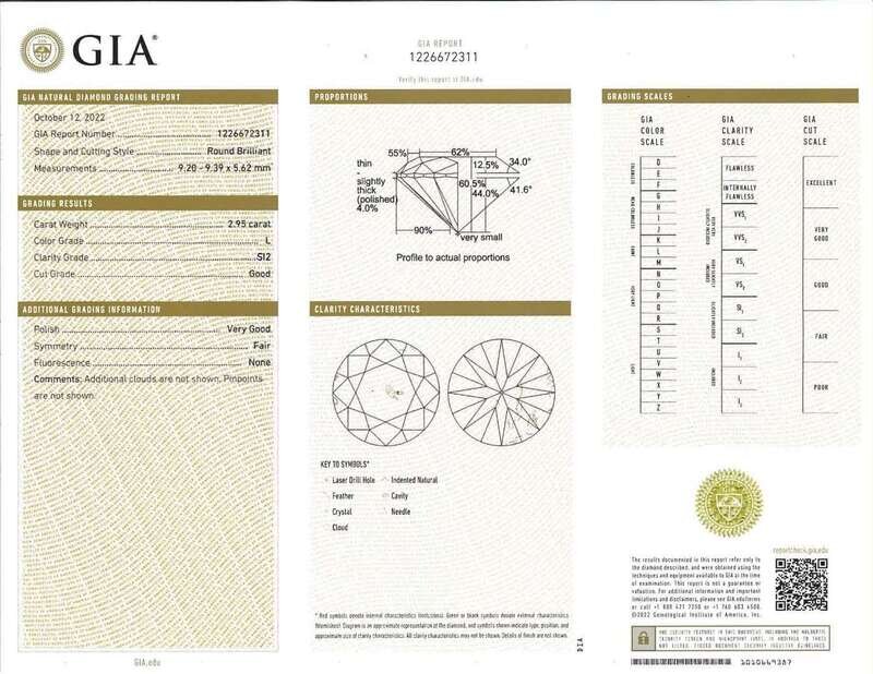 A round brilliant-cut 2.95 carat diamond in a brutalist-style ring setting. Diamond is near colorless (L), with SI2 clarity. GIA certification number: 1226672311.