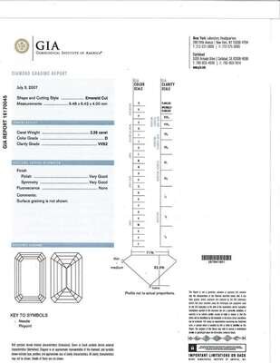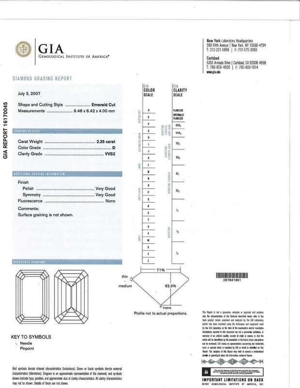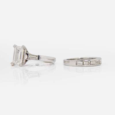 A platinum diamond-accented solitaire diamond ring with platinum and diamond guard ring. The ring centers an emerald-cut diamond weighing approximately 2.25 carats, near colorless (D), with VVS2 clarity, and no fluorescence, and is accented by two tapered baguette-cut diamonds each weighing approximately 0.25 carats. Guard ring is set with seven straight baguette-cut diamonds, approximately 1.00 carat altogether, near colorless (D) with VS1 clarity. Total estimated weight of diamonds: 3.75 carats. Center diamond accompanied by GIA report number: 16170045.