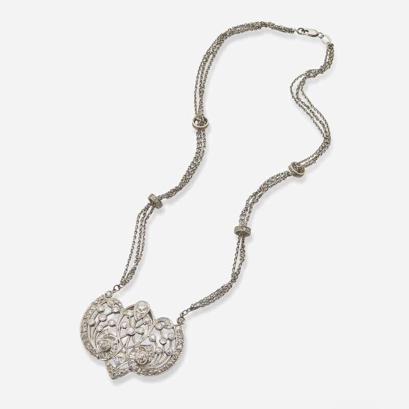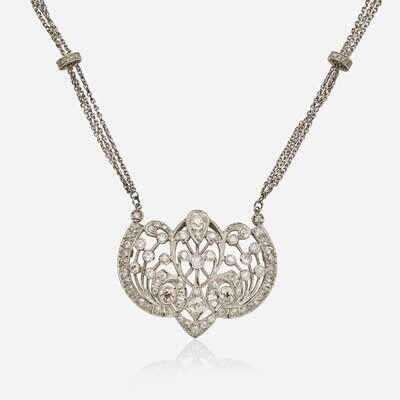 An Edwardian and diamond pendant set with old European-cut diamonds, on a 14K white gold chain station-set with single-cut diamonds. Diamonds are near colorless to some color (H - M), with SI - I clarity. Total estimated weight of diamonds: 4.30 carats.