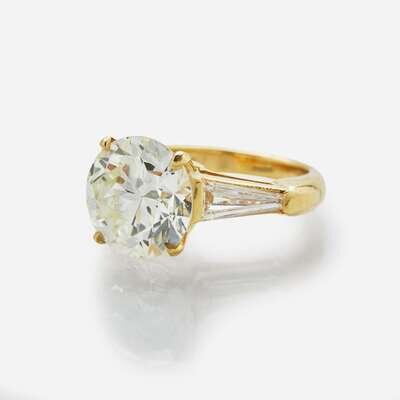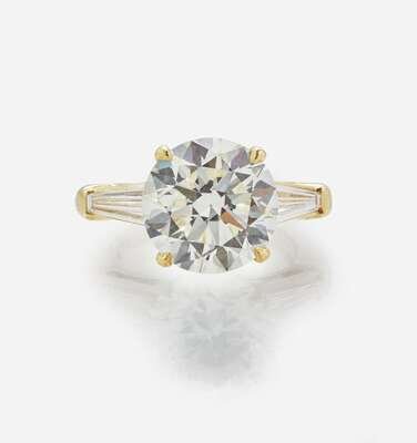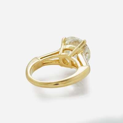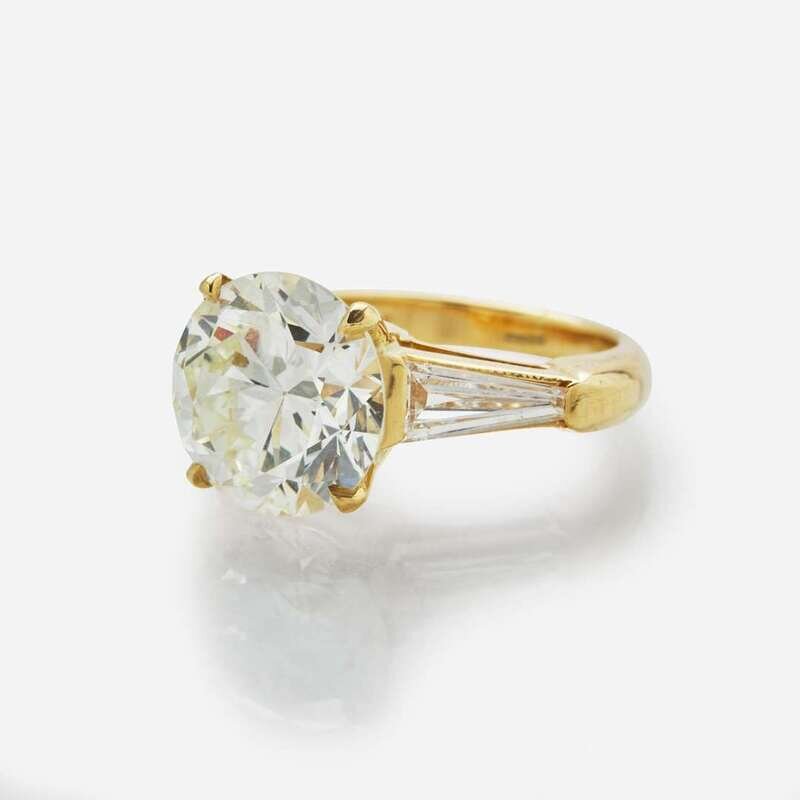 An 18K yellow gold ring, featuring a prominent 5.85 carat round brilliant-cut diamond, flanked by two tapered baguette-cut diamonds. Center diamond has faint color (K), and VVS2 clarity, while baguette-cut diamonds are near colorless with SI clarity. Total estimated weight of diamonds: 6.85 carats. Accompanied by GIA certificate number: 2225644458.