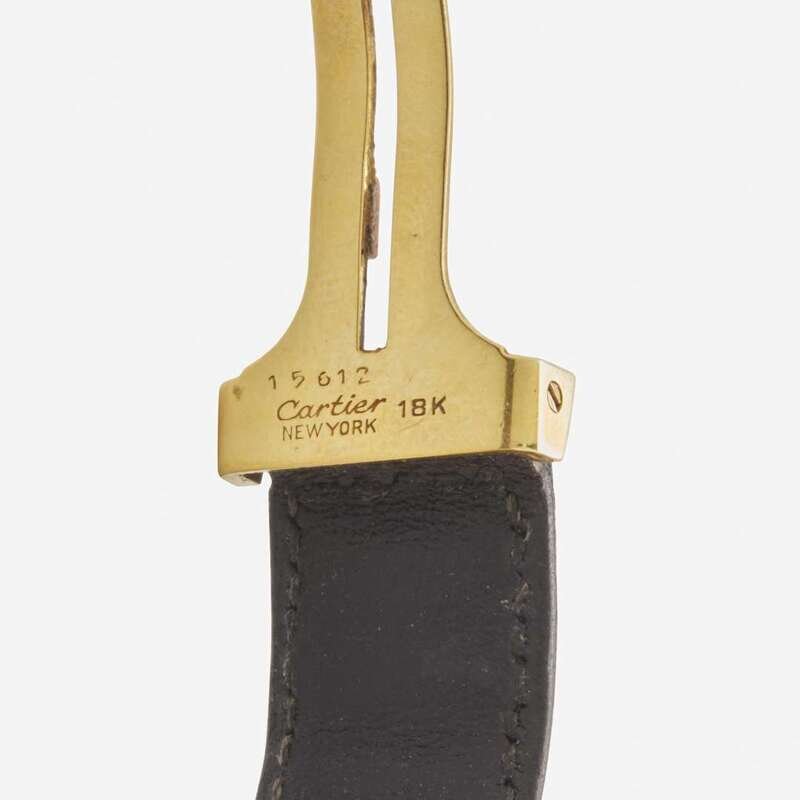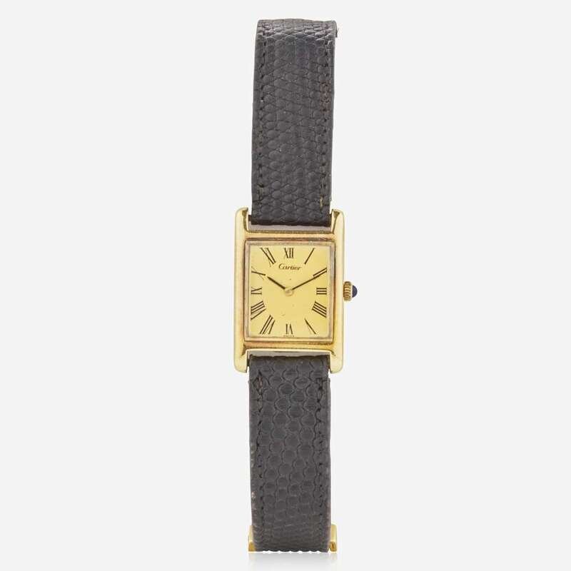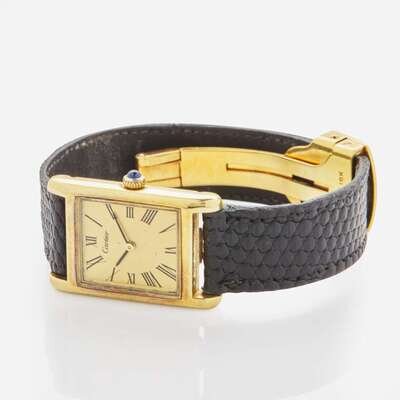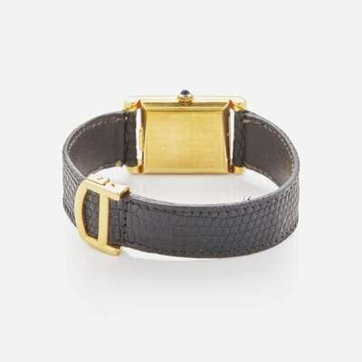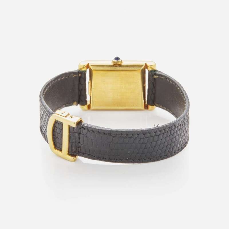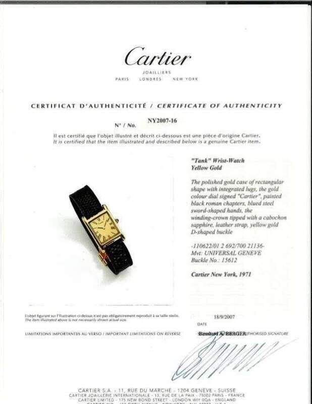 A manual wind Universal Geneve movement Cartier watch in a rectangular polished case with integrated lugs and a gold color dial signed "Cartier". The watch has Roman numeral hour markers, blued-steel sword-shape hands, and a winding crown set with a sapphire cabochon. The watch is on a leather strap with an 18K yellow gold buckle, and is accompanied by a Cartier-issued Certificate of Authenticity.