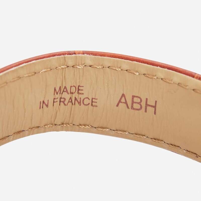 A yellow gold-plated ladies manual wind Cartier tank watch on a brown leather strap. Watch face is white with black Roman numerals at hour intervals, and blued-steel hour and minute hands. The textured crown is topped with a cabochon blue sapphire, and the face reads "Cartier" and "SWISS".