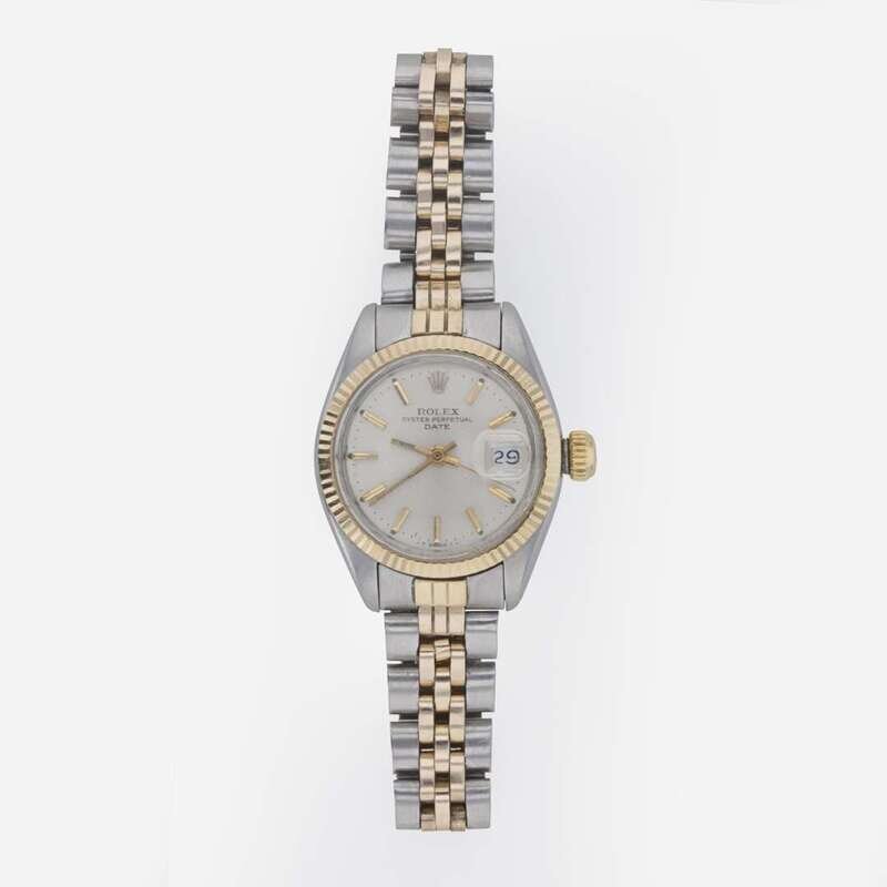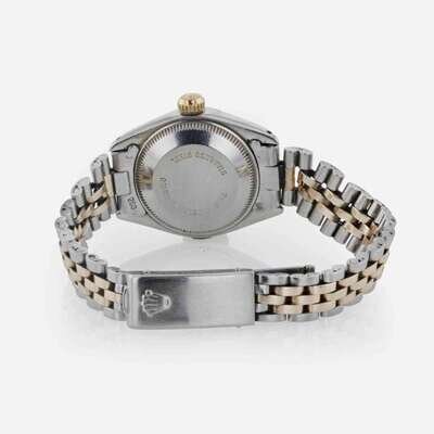 A ladies automatic Rolex Oyster Perpetual Date in stainless steel and 14K yellow gold, on a Jubilee bracelet with stainless steel deployant clasp. The bezel is 14K fluted yellow gold with acrylic crystal. Date complication sits at 3 o'clock, on a white dial with gold stick markers at hour intervals.