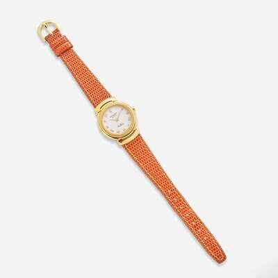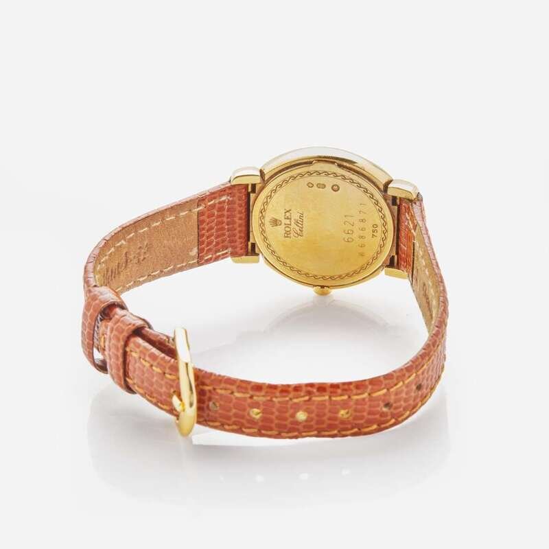 An 18K yellow gold ladies Rolex Cellini, designed with a white dial and gold Roman numeral hour markers, on an aftermarket brown leather bracelet.