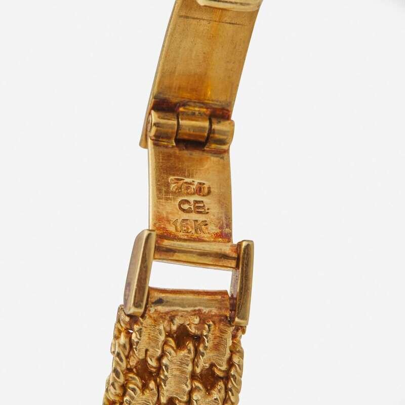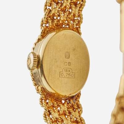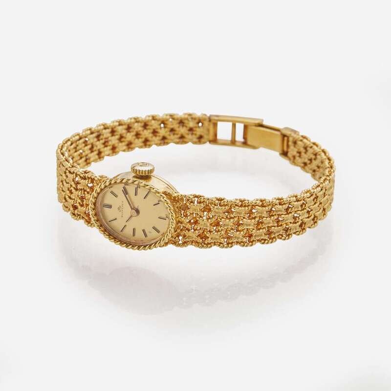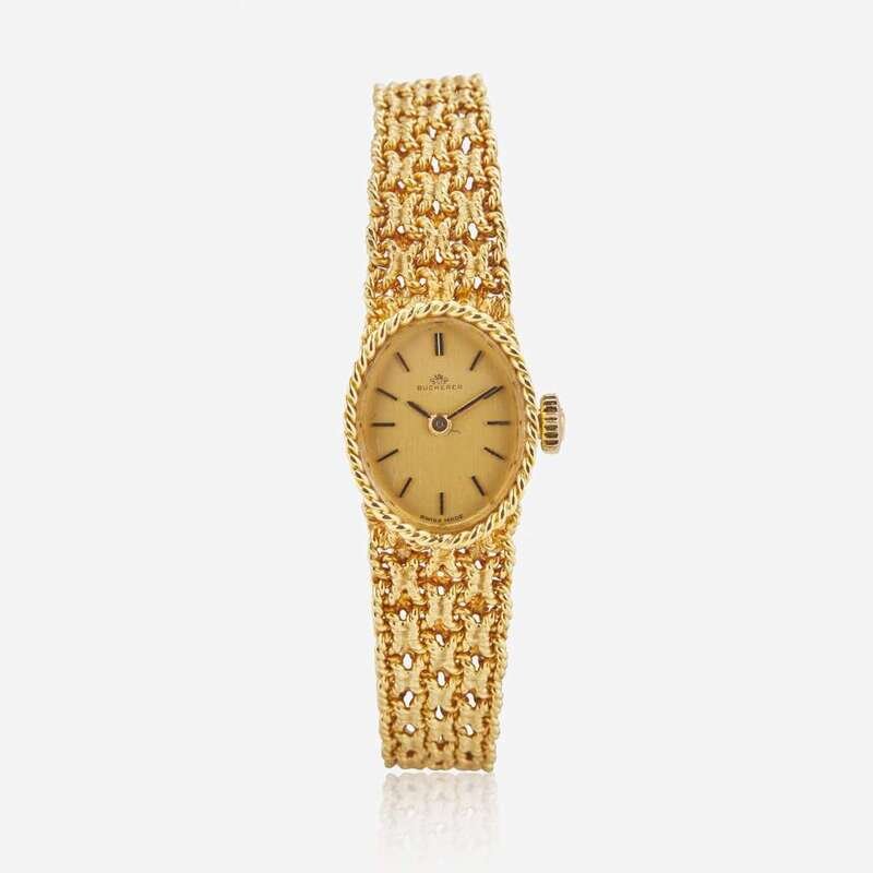 An 18K manual wind Ladies watch by Bucherer with a mesh 18K bracelet. Watch features an oval champagne dial with black stick hour markers and minute and hour hands. Watch face reads "Bucherer Swiss Made", and case measures approximately 17.7mm x 13.8mm.