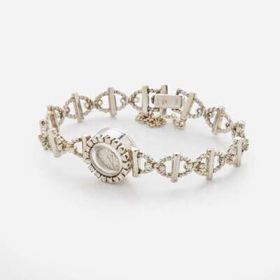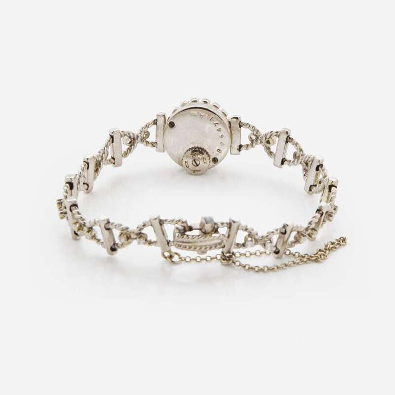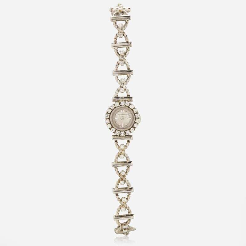 An 18K white gold manual wind ladies Jauger LeCoultre watch, set with forty-two single-cut diamonds around the bezel and down the band. The face of the watch reads "Jaeger LeCoultre Swiss Made", with white gold arrow and circle markers at hour intervals, as well as white gold hour and minute hands. Diamonds are near colorless (I - J), with VS2 - SI1 clarity. Total estimated weight of diamonds: 0.45 carats.