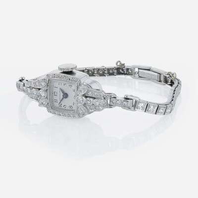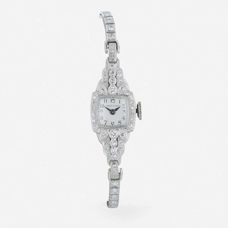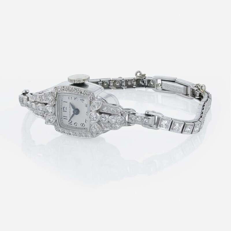 A ladies watch by Hamilton, 17 jewel movement with platinum case and bracelet set with single-cut diamonds. Total estimated weight of diamonds: 0.90 carats.