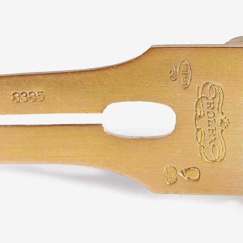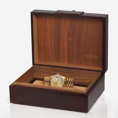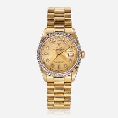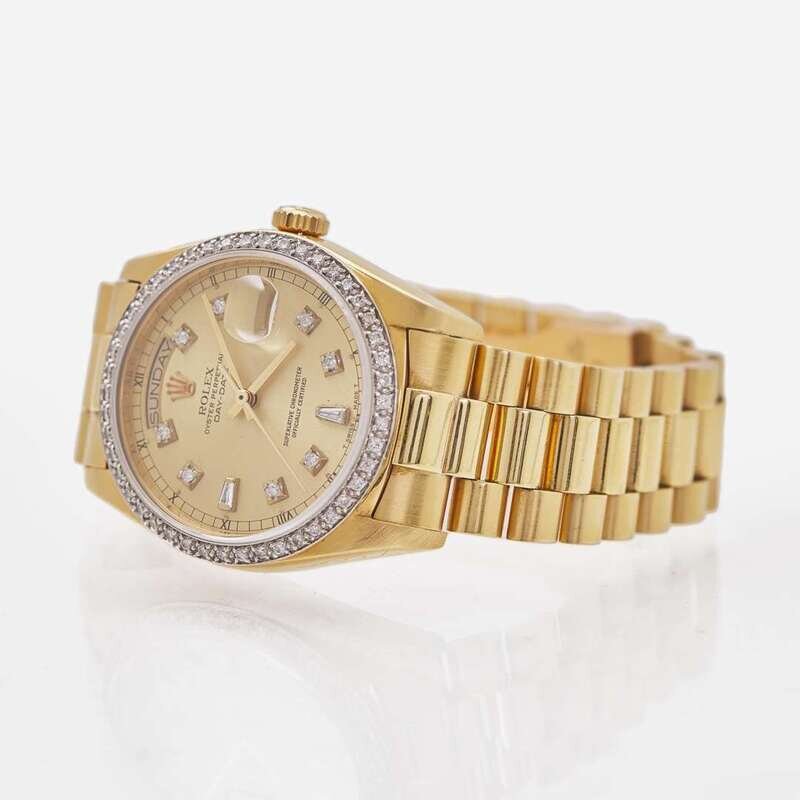 An 18K yellow gold men's Rolex Presidential 18038, with Presidential day date dial, diamond hour markers, and gold hands. The bezel is set with fifty-seven near colorless round-cut diamonds and two baguette-cut diamonds. Total estimated weight of diamonds: 0.70 carats.