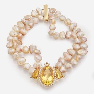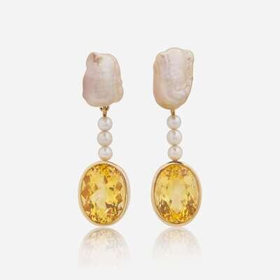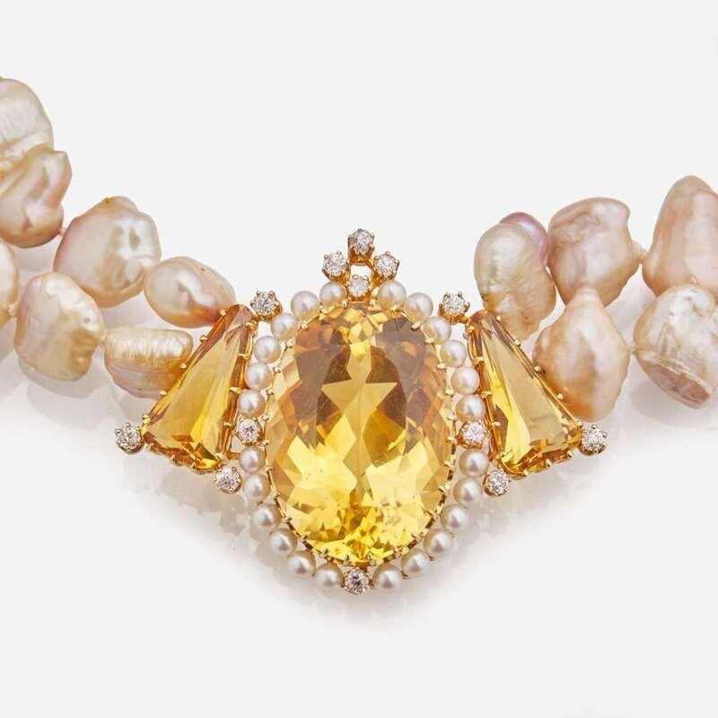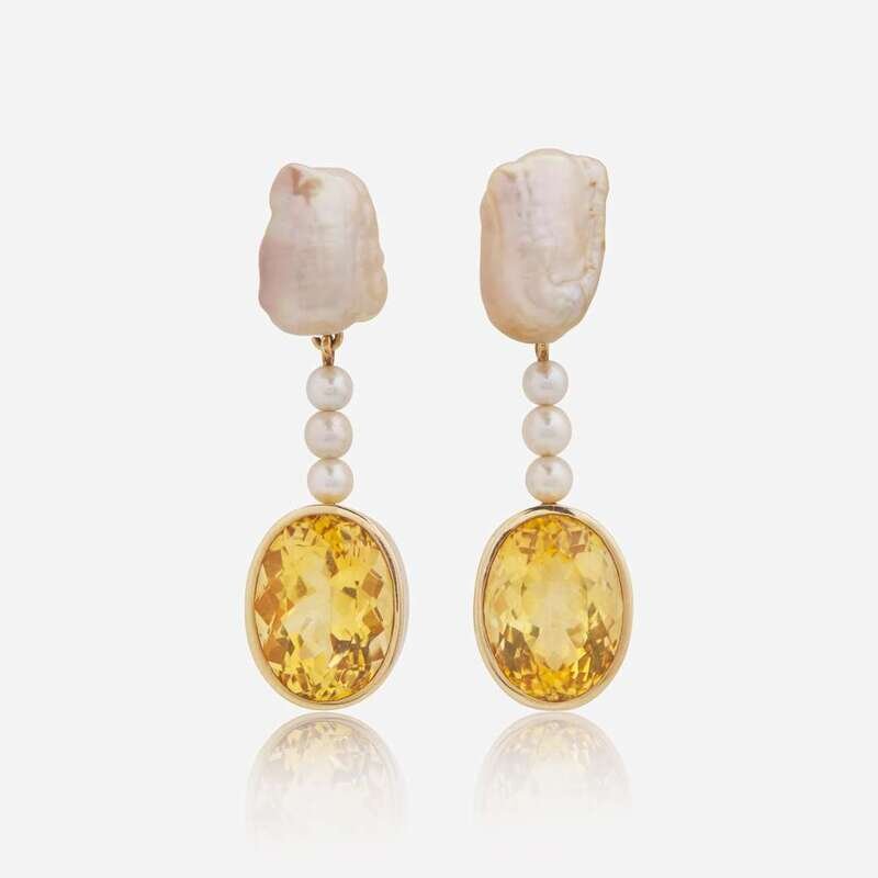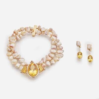 A matching necklace and earrings, designed with 14K yellow gold, baroque and seed cultured pearls, citrine, and diamonds. The necklace is formed from two strands of baroque pearls each measuring approximately 14.00mm x 10.00mm, centering on a pendant with an oval-cut citrine measuring approximately 32.00mm x 22.40mm, approximately 50.00 carats, and flanked by two triangular citrines each measuring approximately 20.50mm x 10.00mm, accented by eleven old European-cut diamonds and twenty-four cultured pearls each measuring approximately 3.50mm. The matching drop earrings with stud posts and omega clip backs center two oval-cut citrines each measuring approximately 16.30mm x 12.10mm, with six cultured pearls each measuring approximately 4.30mm and two baroque pearls each measuring approximately 16.40mm x 10.30mm. Diamonds are near colorless (I - J), with SI clarity. Total estimated weight of diamonds: 0.80 carats.
