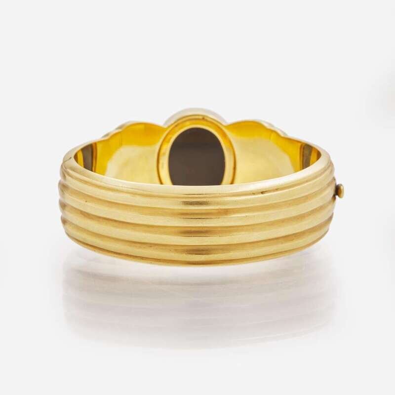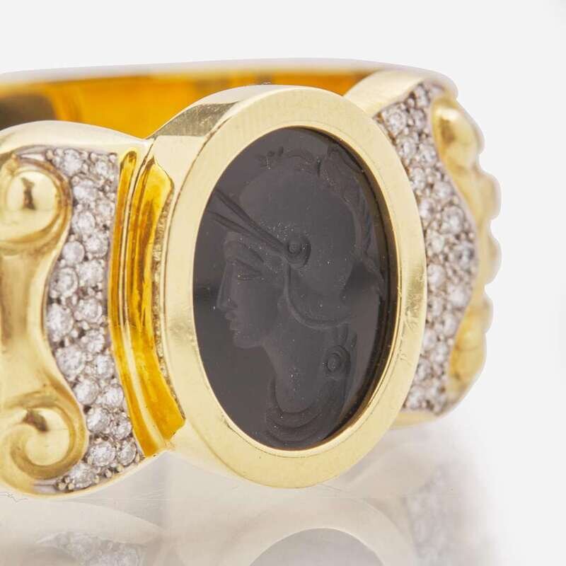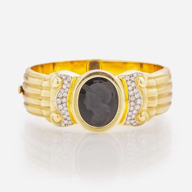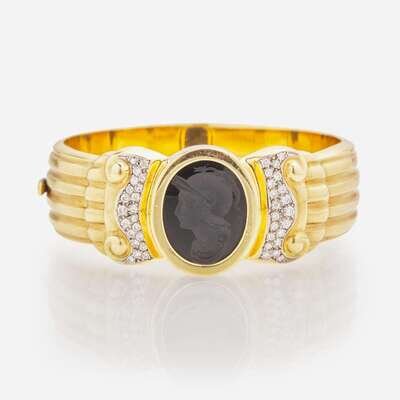 An 18K yellow gold textured bangle centering a bezel-set black onyx intaglio cameo and accented by forty-two round brilliant-cut diamonds. Diamonds are near colorless (H - J), with VS clarity. Total estimated weight of diamonds: 1.00 carat.