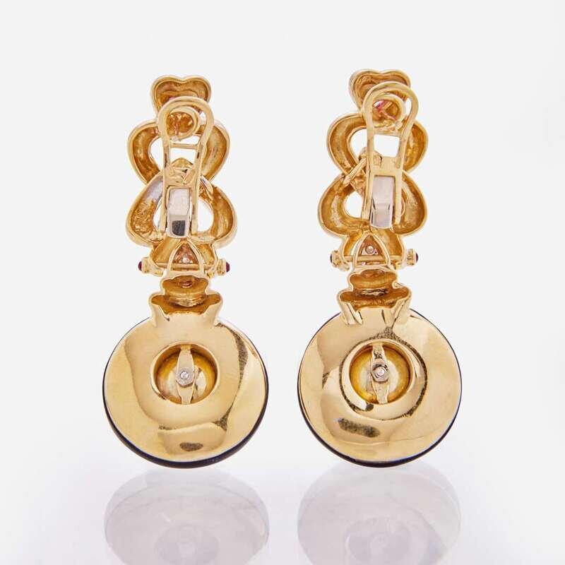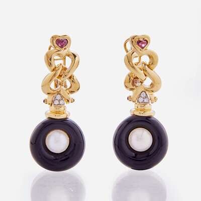 A Pair of Black Onyx, Pearl, and Tourmaline Angiolino & Zogno Earrings
