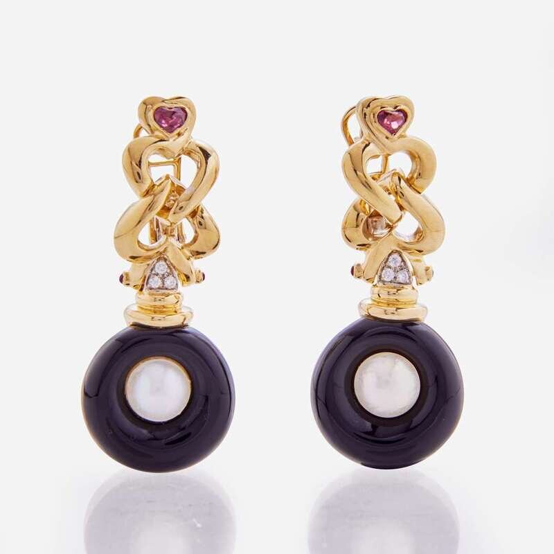 A pair of Italian-made 18K yellow gold earrings by Angiolino & Zogno designed as interlocking hearts, set with two mabé pearls each measuring approximately 10.00mm, two black onyx each measuring approximately 23.37mm, six round-cut diamonds, and two heart-shape pink tourmalines each measuring approximately 4.82m x 3.55mm. Diamonds are near colorless (H - I), with SI clarity. Total estimated weight of diamonds: 0.20 carats.