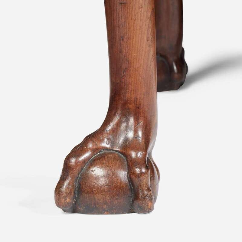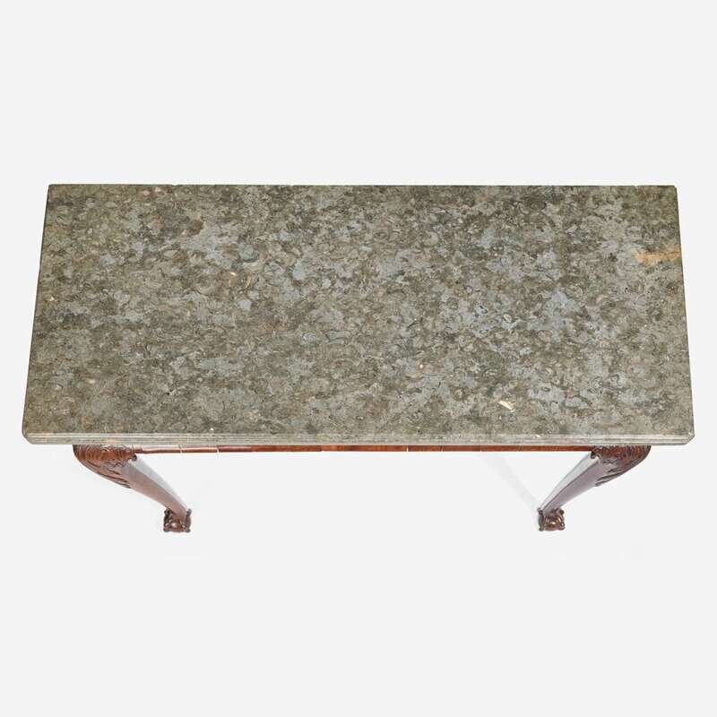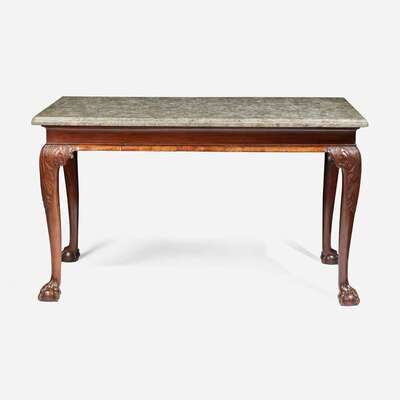 The table frame with plain frieze and molded edge, cabriole legs with acanthus-carved knees, on ball-and-claw feet, the marble top with molded edge and notched front corners.