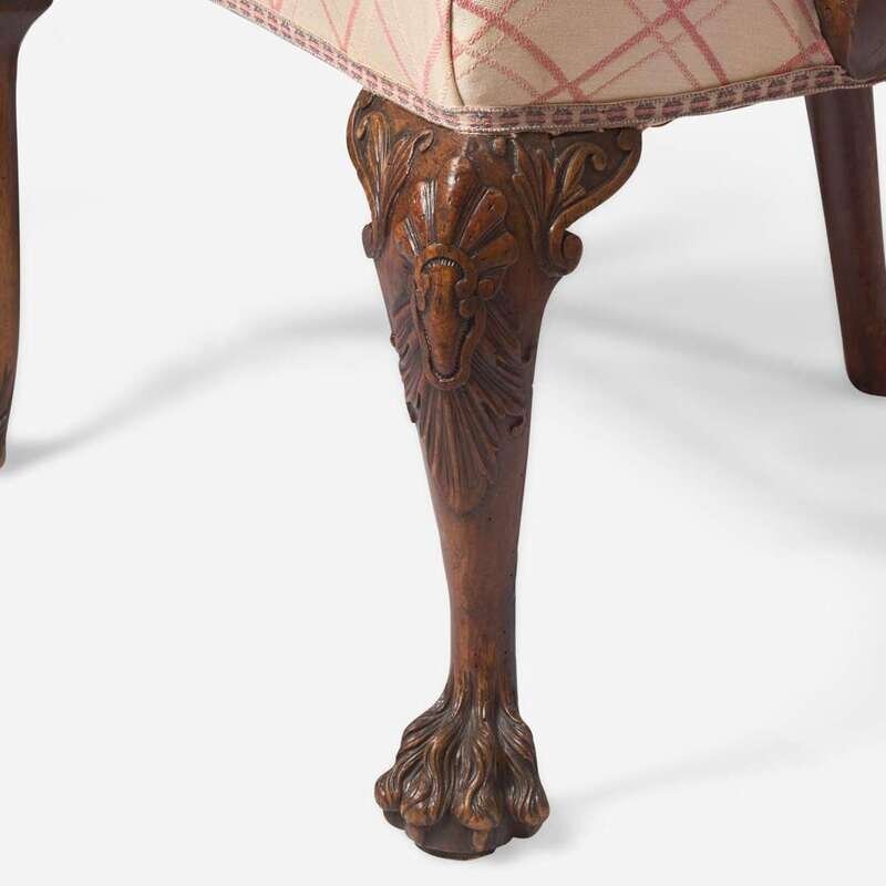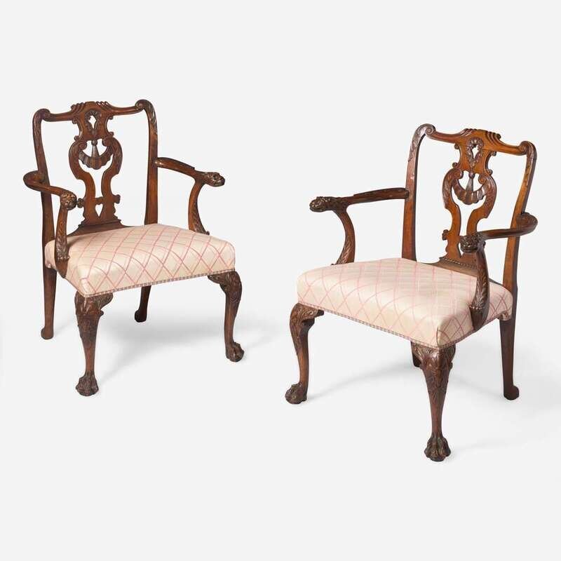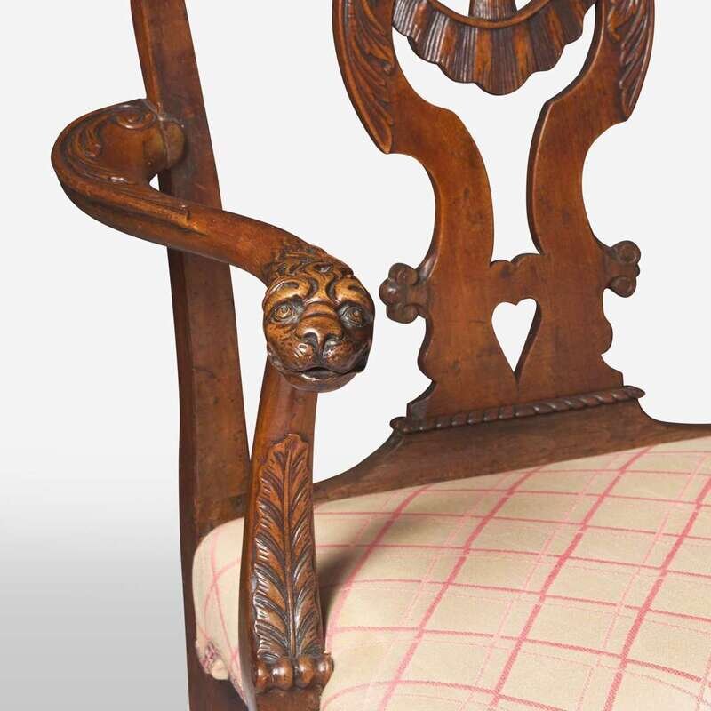With carved and pierced vasiform splats having tassel, heart, acanthus, and scroll motifs, shaped crests, scrolled arms with acanthus carving and lion’s head terminals, and cabriole legs with shell and rocaille motifs terminating in hairy paw feet, custom upholstery.