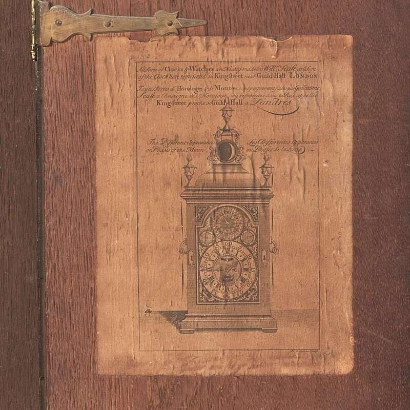 The hood with stepped sarcophagus top with three brass steeple finials, frieze and spandrels with carved blind fretwork, the arched brass face engraved, "William Scafe London," with applied brass spandrels, the case with arched door, line inlaid detail, on molded base, the case door interior retaining paper label advertisement for William Scafe.