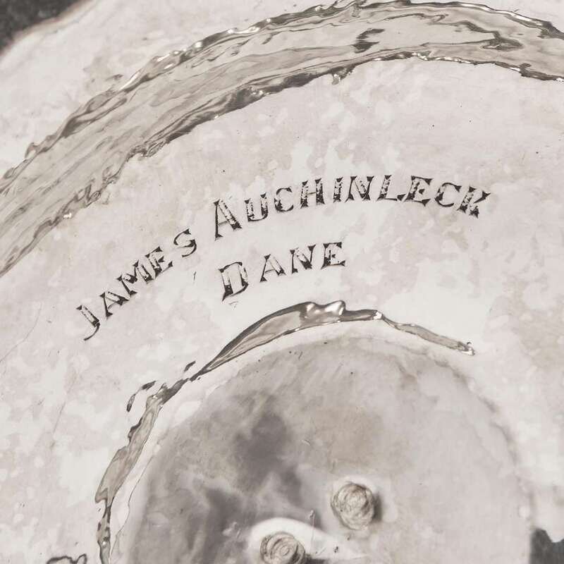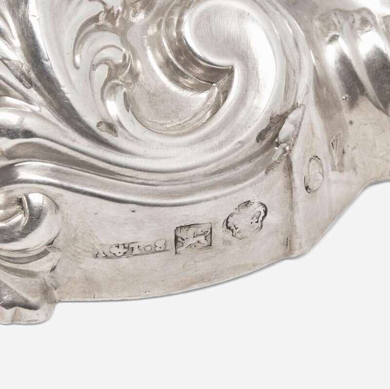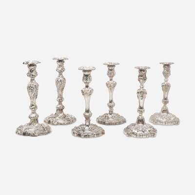 Comprising a pair by John & Thomas Settle, Sheffield, 1822, marked; an assembled pair, one by maker "..I./ N.C." (partially rubbed, the bobeche marked separately with rubbed maker's mark "FB" (?)), Sheffield, 1828, and the other by maker "C.F," Sheffield, 1846, both engraved to underside, "Jane Auchinleck Dane"; and a pair by Saml. Chas. Young & Co., Sheffield, 1818, bearing monogram, "WFT"; all marked, and with detachable bobeches.