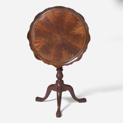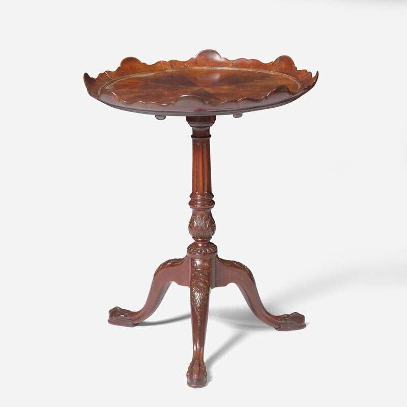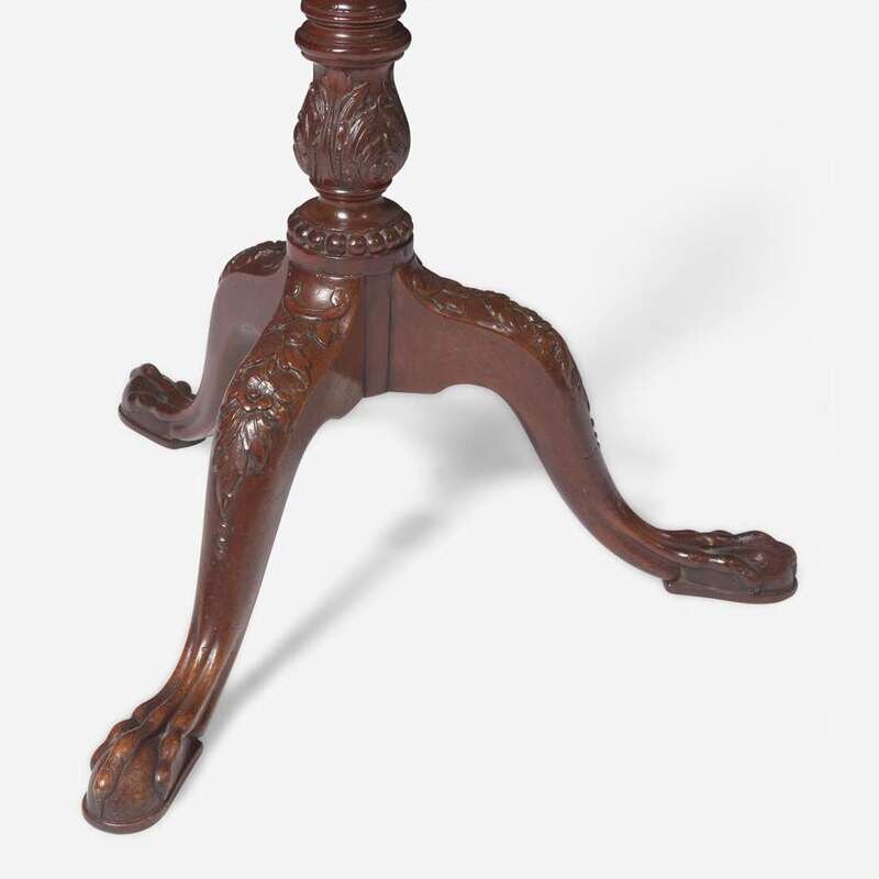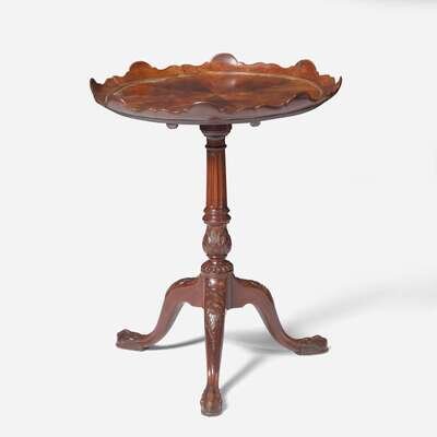 The top with radiating veneer and flared scalloped rim, on carved and fluted split baluster support with lower beaded molding, three cabriole legs with carved c-scrolls, acanthus, and flowers, on ball-and-claw feet, retaining iron spider brace.