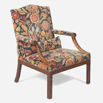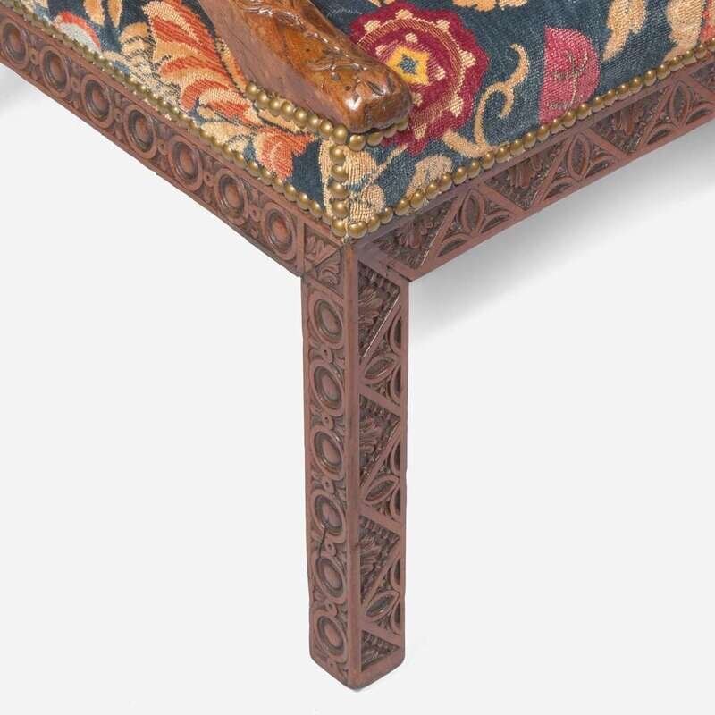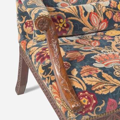 Arched backrest, rolled arms with carved rosettes and leafage, intricately carved legs and frame, custom floral upholstery.