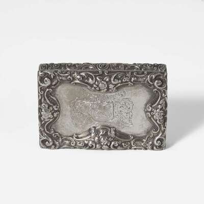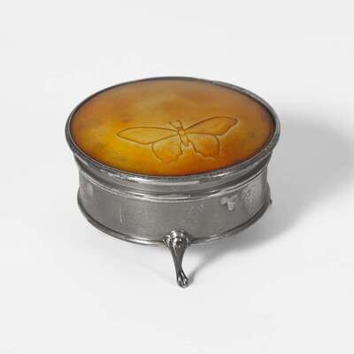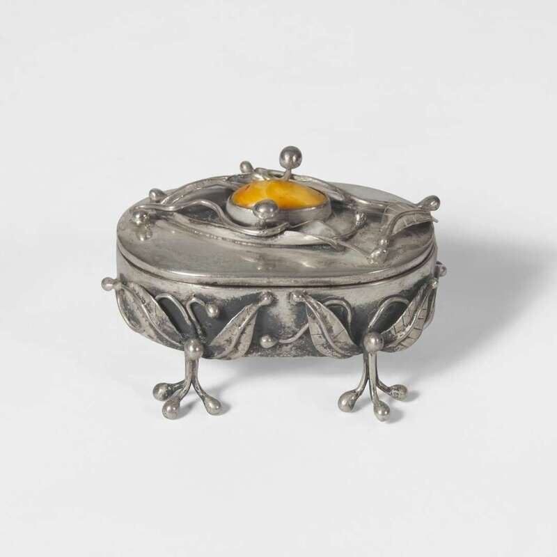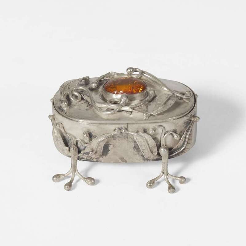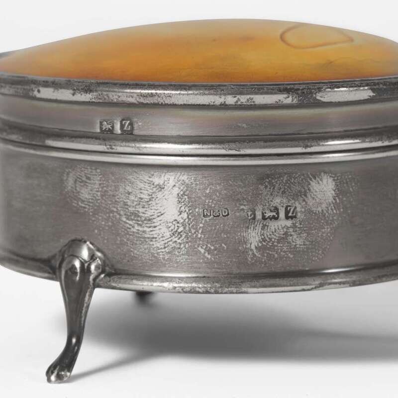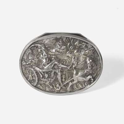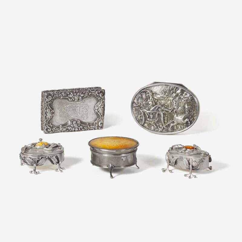 Comprising a George III gilt-washed sterling silver repoussé oval box depicting Apollo as charioteer, Alexander J. Strachan, London, 1806, marked; a Victorian gilt-washed sterling silver repoussé armorial box, Nathaniel Mills, Birmingham, 1846, the crest inscribed, "Omni Vincit Amor," marked; an Art Deco sterling silver circular box with enamel cover with butterfly motif, Napper & Davenport, Birmingham, 1924, marked; and two conforming Art Nouveau silver boxes set with amber cabochons, maker "RO," possibly Latvian or Baltic Region, early 20th century, marked with maker's and standard marks.
