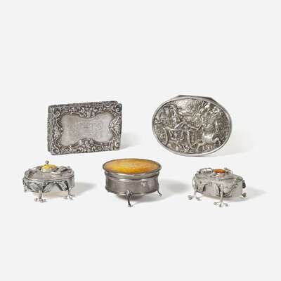 A group of five assorted sterling silver and silver-mounted boxes Various English and Continental makers, various dates ranging 1806-1924