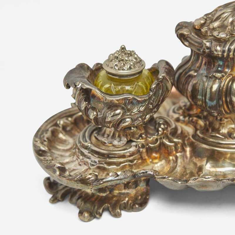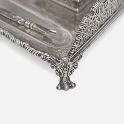 H: 4 in. W: 11 in. D: 7 1/2 in. (sterling silver inkwell), Weight: 28.105 oz. t. (sterling silver inkwell base only)