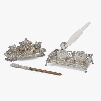 Comprising a Victorian sterling silver inkwell with pierced gallery and scrolled feet, by Walter, Michael, and John Barnard with Robert Dubock, London, 1897, with two sterling silver-mounted cut glass ink bottles, all marked; a silver letter opener and quill pen, marked; a silver-plated Rococo style inkwell with two cut glass bottles, marked; and a sterling silver-mounted faux tortoiseshell paper knife, The Usher Manufacturing Co., Birmingham, 1930, marked.