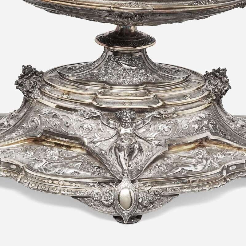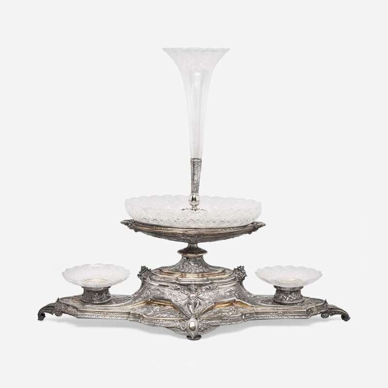 A stepped and raised base decorated with floral garlands, floriate motifs, masques, shields, and reclining putti, the center with cut-glass vase fitted into silver socket, with cut-glass fruit bowl below, each side with detachable cut-glass compotes, no visible marks.