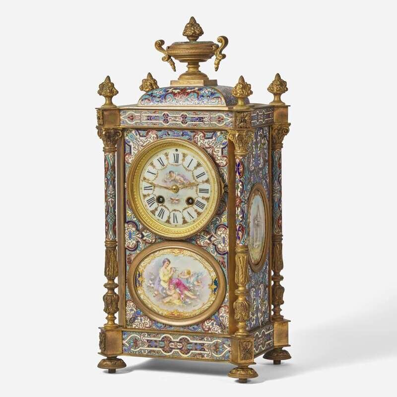 A French cloisonné enamel and gilt-bronze mounted mantel clock with painted porcelain set medallions Imported by Harris & Harrington (1896-1919), New York, circa 1900