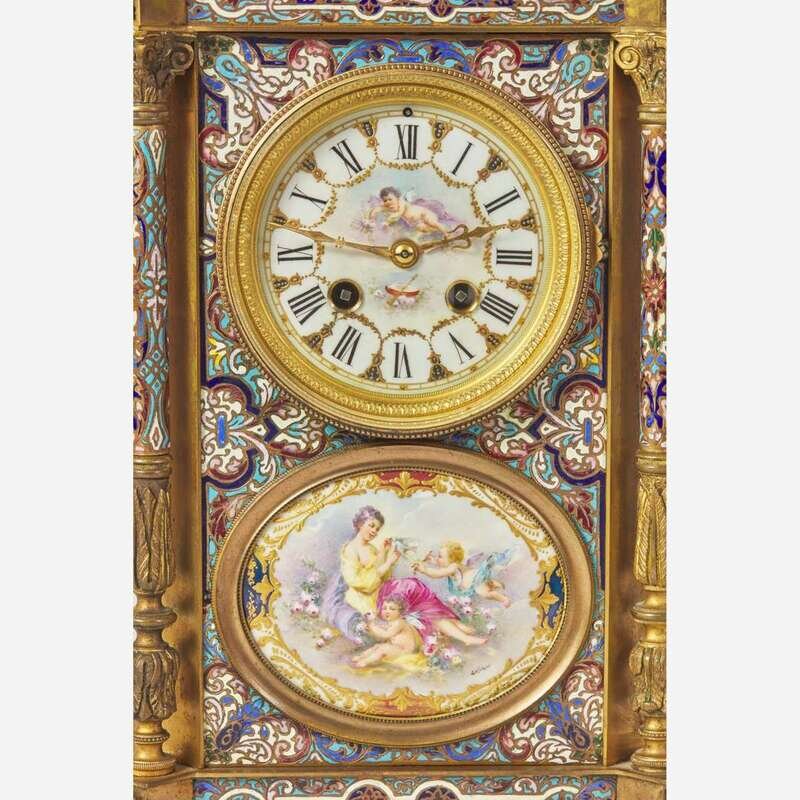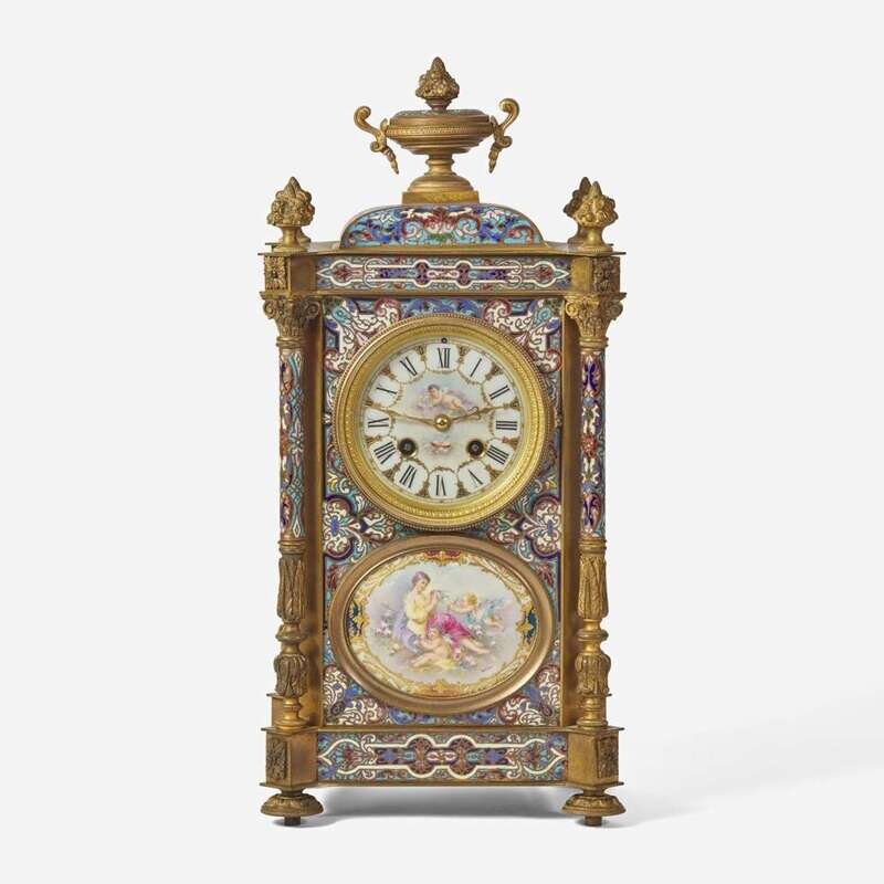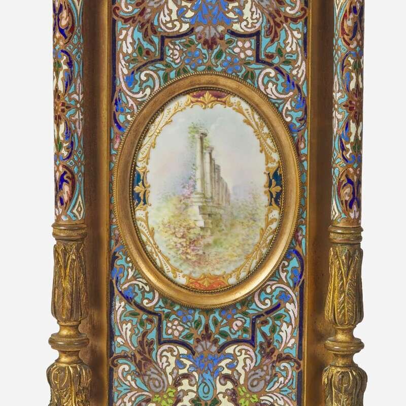 Rectangular case with cloisonné throughout, stepped top, urn and flower basket finials, columns with Corinthian capitals, inset porcelain plaque medallions and dial decorated with ancient ruins, reclining lady and putti, the front medallion signed, "Lefranc," bun feet, the interior mechanism marked, "H&H," "Medaille D'Argent," "Made in France," and "3167/ 6."