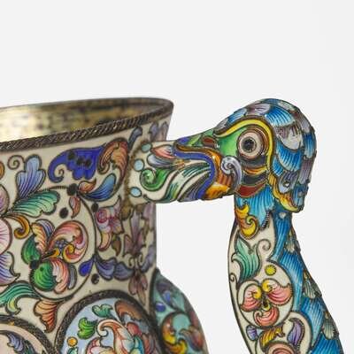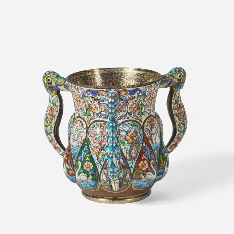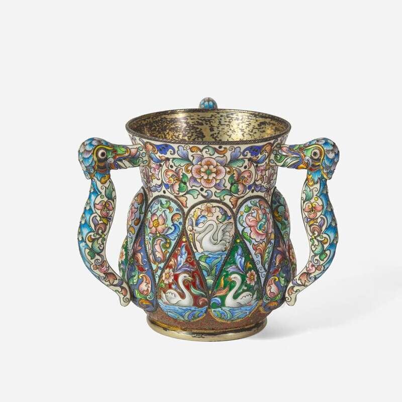 A Russian silver-gilt and shaded enamel three-handled cup Partially obscured hallmarks likely for Feodor Rückert, Moscow, 1896-1908