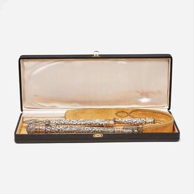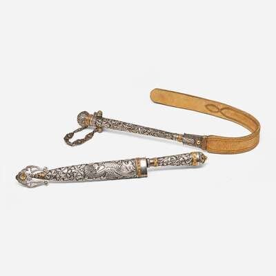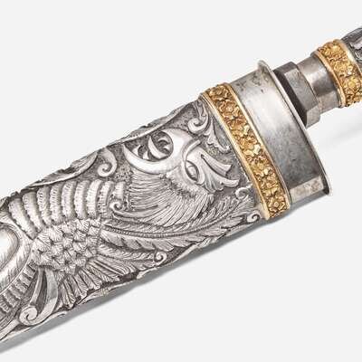 A repoussé silver and gold gaucho knife and flogger Heinrich Böker & Co. Arbolito S.A., Buenos Aires, Argentina, post 1983