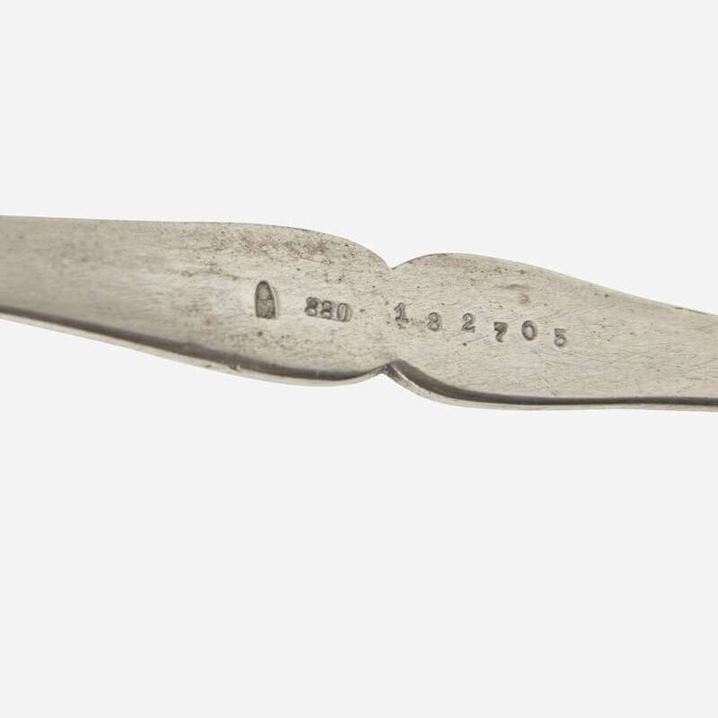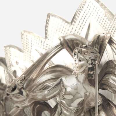 With floriate and leaf-form silver base with figures on either side depicting an archer and fisherwoman, inset cut-glass bowl with shaped and scalloped rim, marked with numerals, "182705," standard mark "880," and import mark for Moscow.