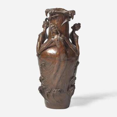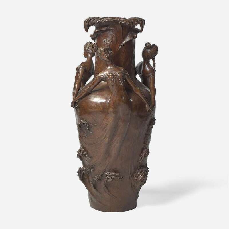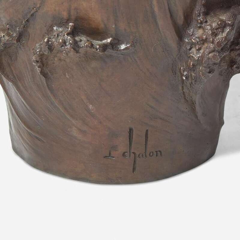 The body and rim in the form of undulating waves, with three emerging female figures with clasped hands, signed along base, "L. Chalon."