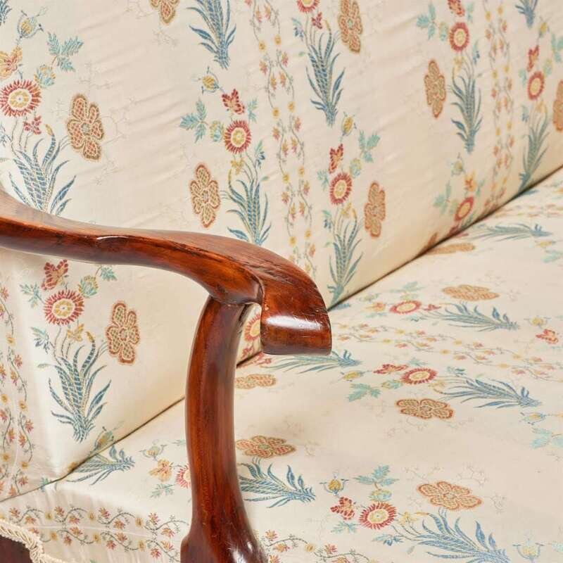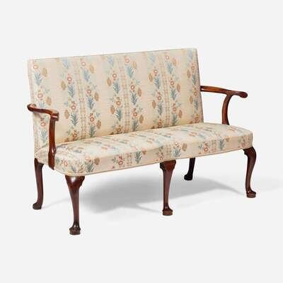 With high upholstered back, scrolled arms, double bowed seat, cabriole legs ending in pad feet, custom upholstery.
