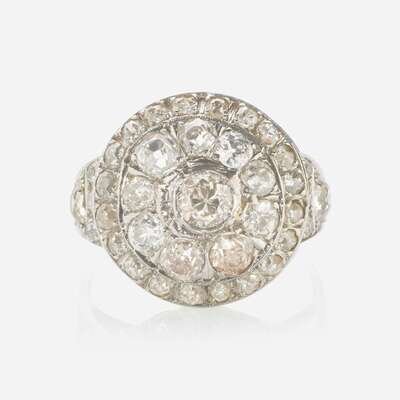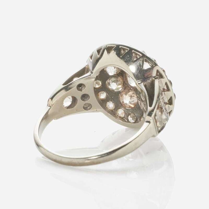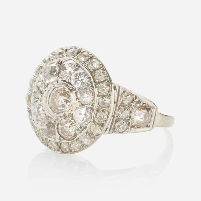 An 18K white gold vintage ring, set with thirty-eight old European-cut diamonds designed in a bulls-eye. Diamonds are near colorless (I - J), some color (M - O), and some light brown, with SI - I clarity. Total estimated weight of diamonds: 3.20 carats.