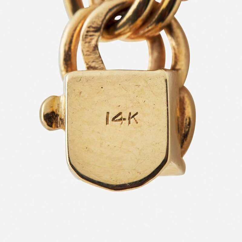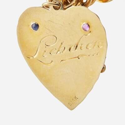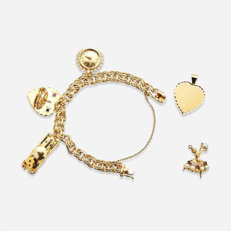 A 14K yellow gold charm bracelet, with a car charm with rubies, sapphires, and cultured pearls, a heart charm depicting a birthday cake and engraved "Liebchen" set with a ruby and sapphires, and a clock charm with moveable hands and cultured pearls, accompanied by two additional charms, one an engraved heart charm reading "2-1-90, Jr: Happy 65th! Love, Matt", the other a dancer set with a ruby, sapphires, and cultured pearls.