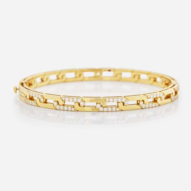 An 18K yellow gold Navarra bangle bracelet by Roberto Coin circa 2010, set with sixty round brilliant-cut diamonds. Diamonds are near colorless (F - G), with VS clarity. Total estimated weight of diamonds: 0.70 carats.