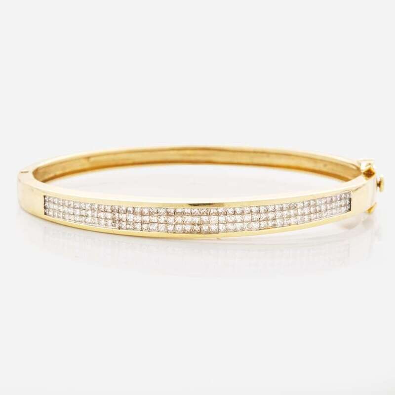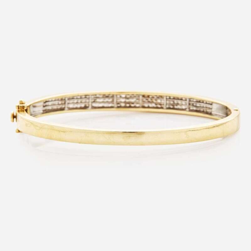 A 14K yellow gold bangle bracelet, invisibly set with one hundred thirty-eight diamonds. Diamonds are near colorless (I - J), with SI clarity. Total estimated weight of diamonds: 2.00 carats.