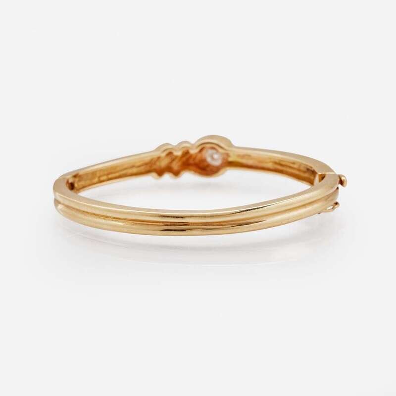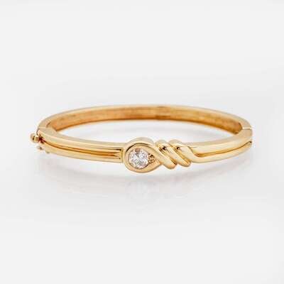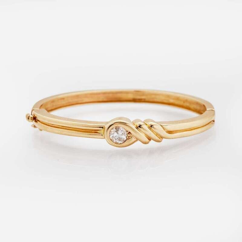 A 14K yellow gold bangle bracelet designed on a hinge, centering an old European-cut diamond. Diamond is near colorless (I - J), with I clarity. Total estimated weight of diamond: 0.90 carats.