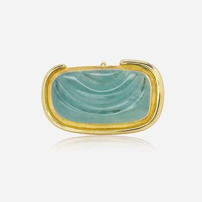 An 18K yellow gold brooch/pendant by Haroldo Burle Marx, centering a forma livre carved aquamarine measuring approximately 42.7mm x 23.4mm x 9.75mm.