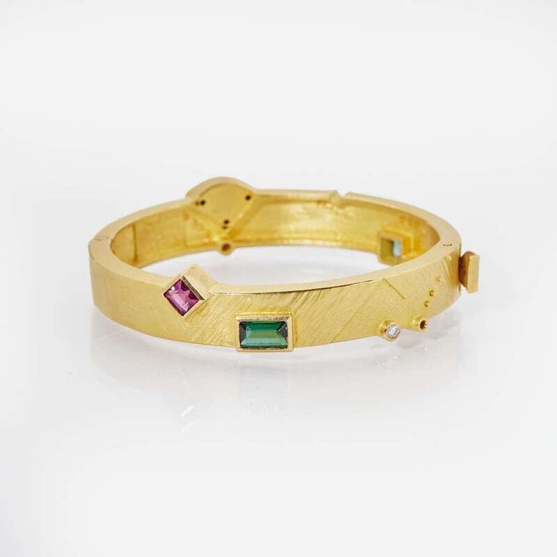 An 18K yellow gold textured bangle made in Israel by Dan Alsberg, set with one bezel-set black opal, one step-cut bluish-green tourmaline measuring approximately 5.10mm x 5.49mm, one step-cut pink tourmaline measuring approximately 5.10mm x 5.34mm, one step-cut green tourmaline measuring approximately 8.28mm x 5.13mm, and two round brilliant-cut diamonds each measuring approximately 2.60mm. Diamonds are near colorless (G - H), with VS clarity. Total estimated weight of diamonds: 0.12 carats.